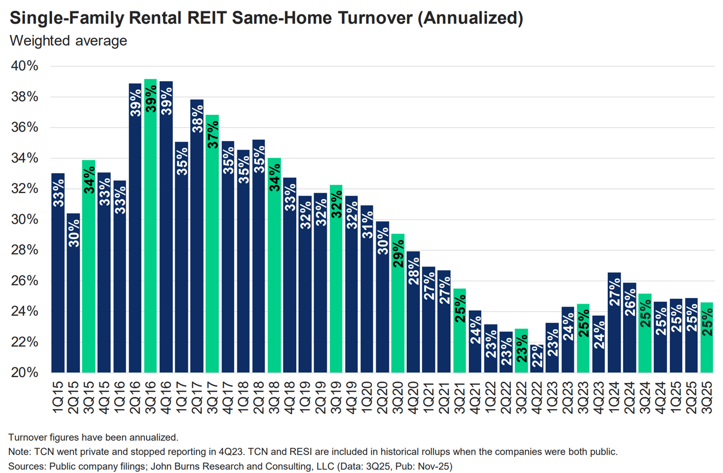 From a pure business standpoint, SFR operators – like most businesses in a fragmented industry – are highly incentivized to create good experiences for their customers. And the data bears this out. The most recent data from SFR REITs show their turnover rates have continually declined over the last 10 years (and this trend continued even when mortgage rates were cheap) – and are now around just 25%.