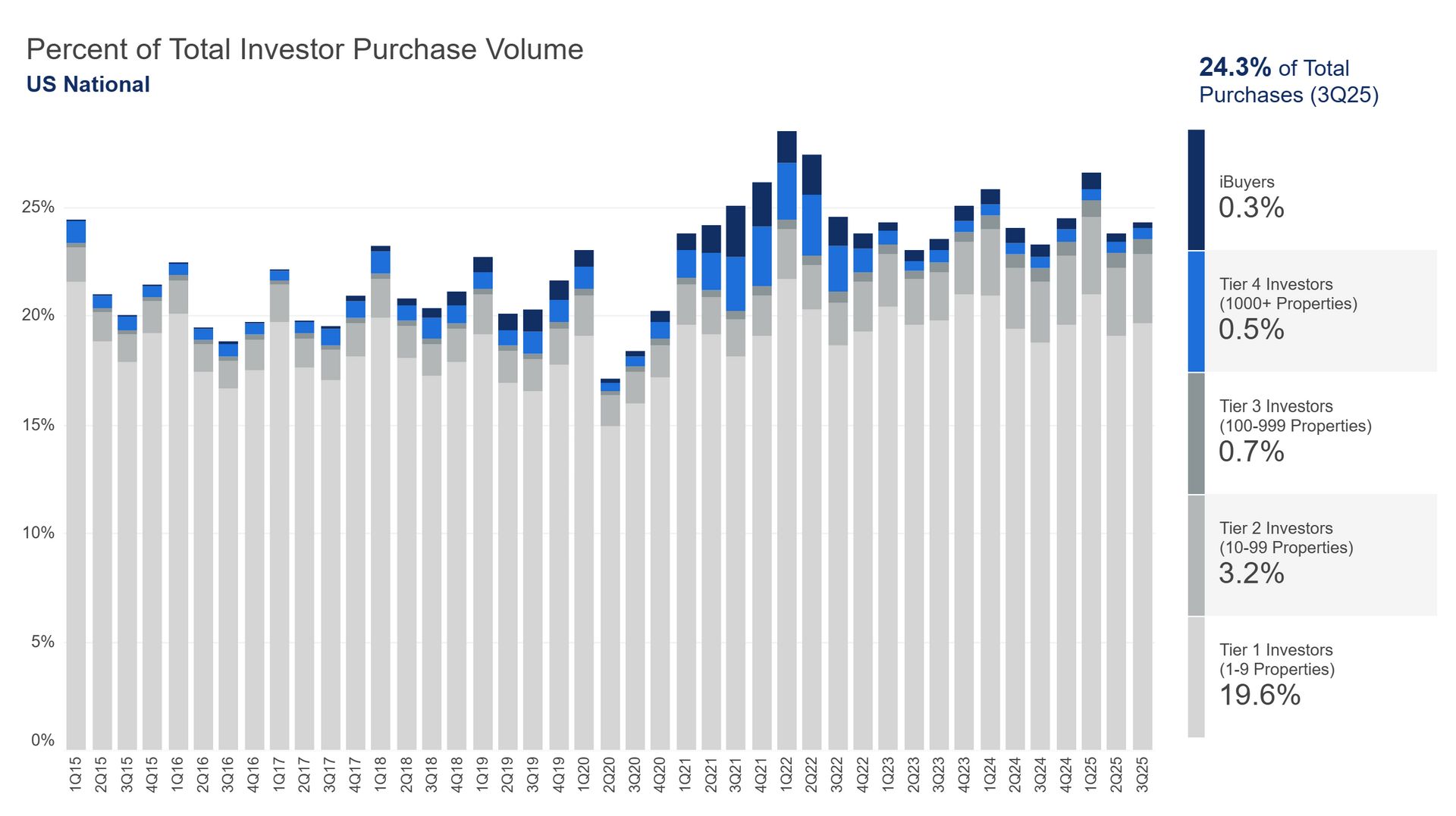 In fairness: Yes, you will find other research arguing that the impact is more significant. However, some of that research traces back to post-GFC era when homebuyers were largely sidelined and that “rescue capital” contributed to reversing the long drop in home prices, thereby helping homeowners reverse equity losses. Researchers from the University of Texas at Dallas wrote: “These findings demonstrate how investor activity can stabilize housing prices in distressed markets, which helps protect the value of neighboring homeowners’ equity.”