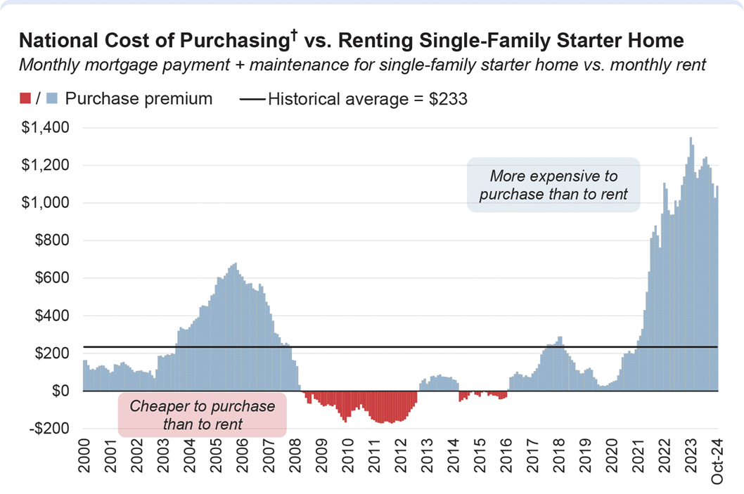 And then onto Chapter 4) Mortgage rates spike, home prices are high, and now there’s a premium of >$1,000 in additional monthly costs versus renting a single-family home.