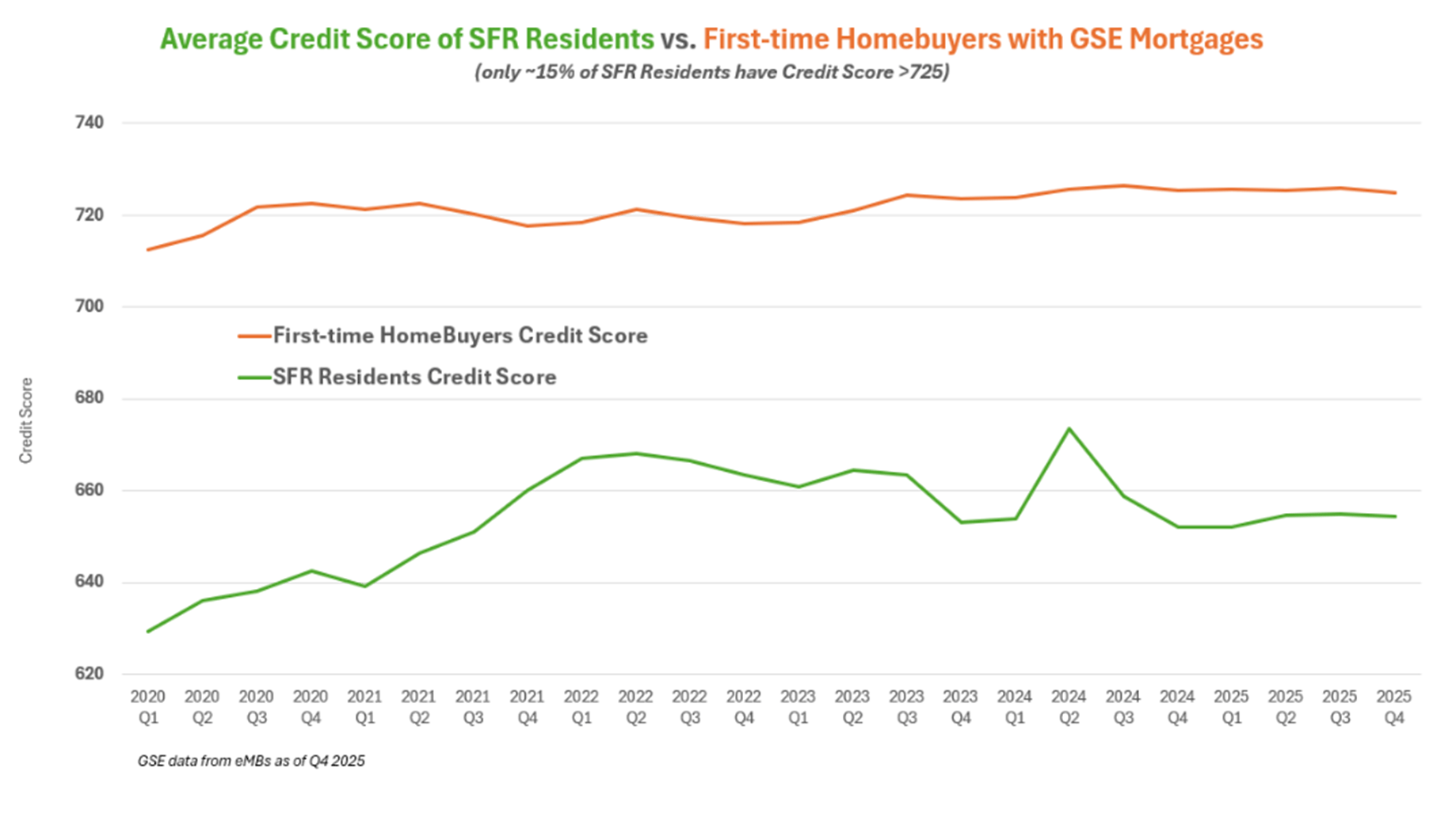 One national SFR operator shared with me this chart (re-sharing anonymously with their permission) showing credit scores of their residents versus credit scores for first-time homebuyers with an agency-backed mortgage. Look at that gap: Renters have credit scores below 660, while first-time homebuyers are above 720.